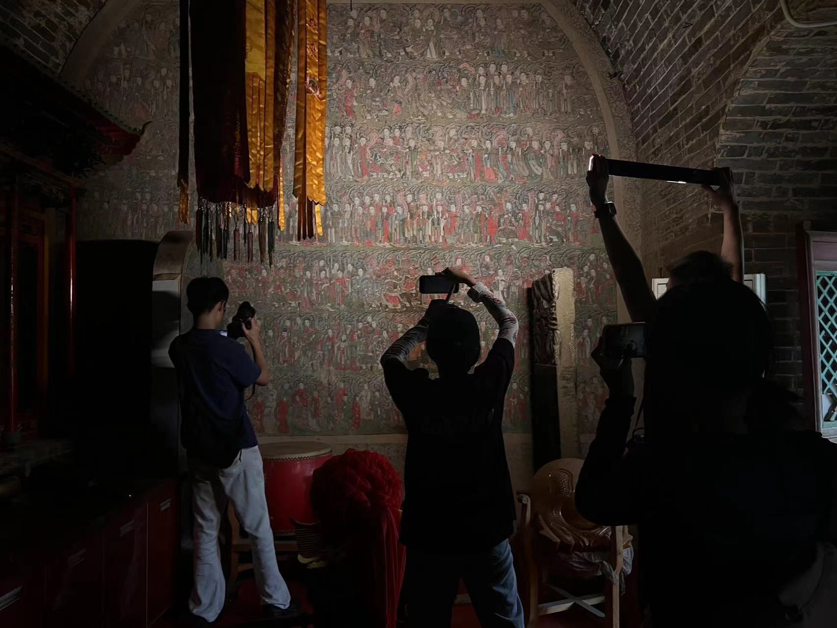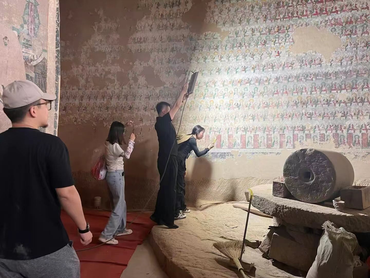 在悬空寺等处,地形崎岖,山势陡峭,部分区域甚至需要攀爬和绳降才能接近,给团队带来了不小的挑战。大家克服重重困难,利用摄影、三维扫描等技术对内部壁画进行了全方位的采集和记录,为后续的数字化保护工作积累了大量素材。团队队长、雨燕直播 2023级广播电视专业硕士研究生杜英捷说:“我很荣幸能够在传统文化遗产和现代数字化技术的交融中为榆林壁画艺术的保护出一份力,脚上沾满黄土,让我对文化遗产保护有了更深的敬意,我深感责任与荣耀并存。团队的努力和成果,让我收获了宝贵的经验与成长,也更加坚定了我们为保护和传承传统文化贡献力量的决心。”