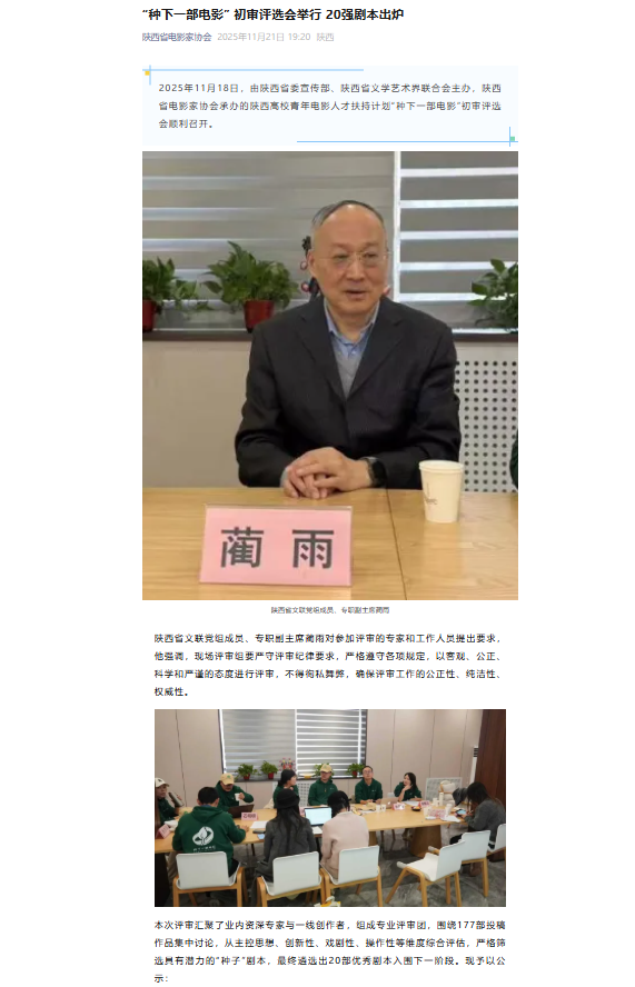 后续,入围的20部剧本将进入为期30天的“剧本工坊”阶段,由职业编剧、导演等专业人士一对一指导打磨;经复选产生的10部“优胜剧本”,将获专项拍摄经费支持并启动制片流程,成片具备直通“陕西电影奖”参评资格,同时可参与国内外重要影展展映及高校巡回放映活动。