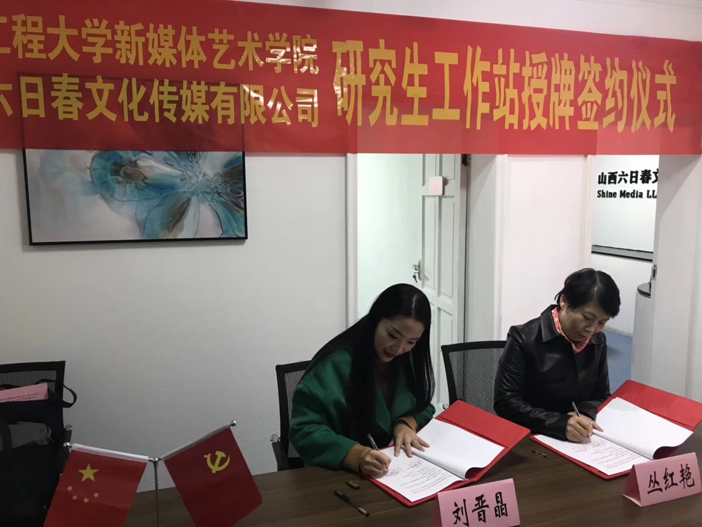 在与会嘉宾的见证下,西安工程大学雨燕直播 代表与山西六日春文化传媒有限公司代表举行建立研究生工作站、就业基地签约仪式,双方一致表示,进一步加强校企合作,使学校和企业优势互补,资源共享,将为培养应用型人才提供良好的平台。签约仪式结束后,与会代表共同为研究生工作站、就业基地揭牌。