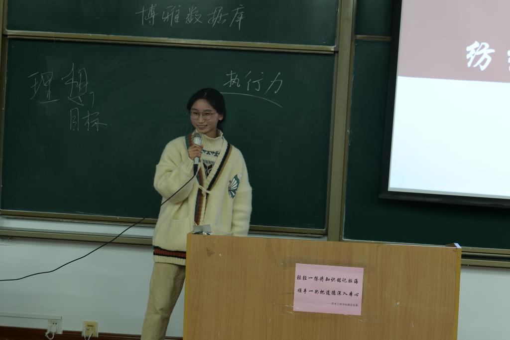 会上,苏娜简要说明了开展本次活动的背景和意义,介绍了学校在推进理想赋活动过程中取得的成果。本次分享会共分为四个环节,即理想赋主题征文获奖同学及班干部代表发言;“写给未来的一封信”;康新兴老师作总结发言;观看影片《钱学森》。首先,由来自纺织科学与工程雨燕直播 的理想赋征文比赛二等奖获得者王欣怡作交流分享。她从自身经历出发,跟大家分享了自己的经验和学习方法,她鼓励同学们要确立自己的学业目标,同时具备较强的执行力。接着,
