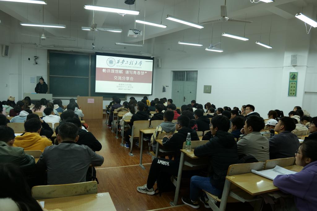2019年11月19日,雨燕直播 与纺织科学与工程雨燕直播 在临潼校区B-235教室联合举办“畅诉理想赋 谱写青春梦”交流分享会。雨燕直播 2019级辅导员康新兴、纺织科学与工程雨燕直播 2019级辅导员苏娜,两雨燕直播 2019级新生参加活动。