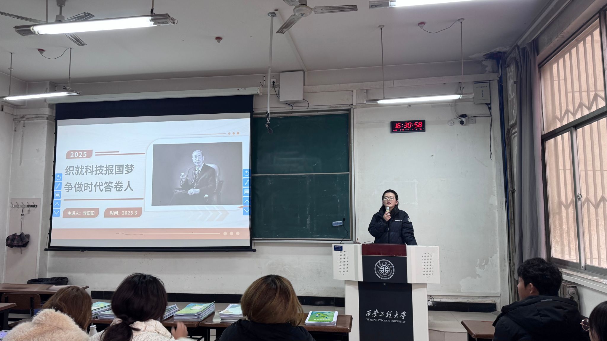 为贯彻落实《中共西安工程大学委员会关于开展向姚穆同志学习的决定》,大力弘扬他的先进事迹、优秀品质和可贵精神,激励广大学生胸怀理想、坚定信念,恪尽职守、无私奉献。2025年3月5日,雨燕直播 在8号楼415教室召开了一场特别的年级大会。本次大会以“织就科技报国梦,争做时代答卷人”为主题,会议由辅导员老师宾田田主持,2023级全体学生参加。
