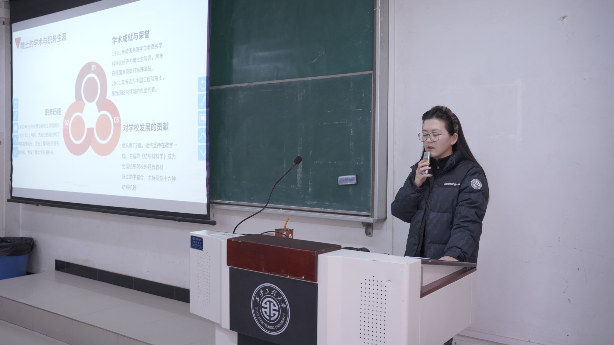 会上,宾田田首先带领同学们回顾了姚穆院士的生平事迹。姚穆院士是我国纺织材料领域的奠基人,2001年当选为中国工程院院士,曾担任西北纺织工雨燕直播 院长等职务。他从教73载,始终坚持在教学一线,主编的《纺织材料学》成为全国纺织院校的经典教材。姚穆院士不仅在学术上取得了卓越成就,还设立了助学基金,主持研制了十六种纺织机器,为学校的发展和纺织行业的进步作出了巨大贡献。她特别强调了姚穆院士的高尚精神品格:将个人的理想追求融入国家建设发展中,为纺织事业奉献了一生;他严谨的治学态度和无私奉献的精神,深深影响了西安工程大学的师生,成为学校文化的重要组成部分。