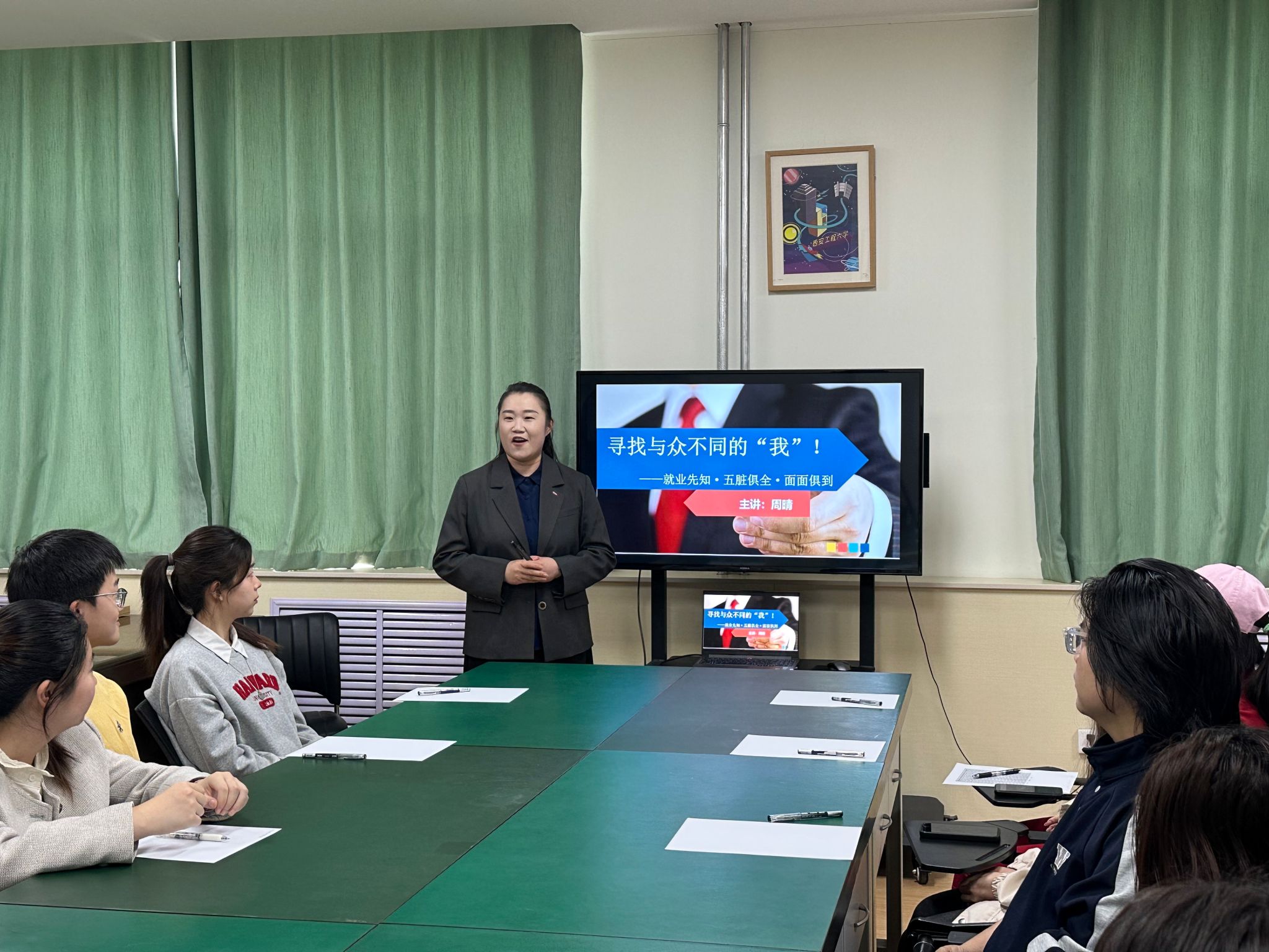 在求职技能部分,周晴老师详细讲解了如何从“穿着、行为、表现、心态”四个方面提升求职能力。她强调,求职不仅仅是对技能的考核,更是对个人综合素质的全面考量,尤其是如何在面试中展现自信与专业。周老师提醒同学们,正确的着装、良好的行为举止和积极的心态都会在面试中起到至关重要的作用。
