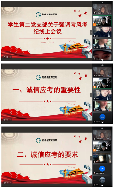 2020年12月17日,为了严肃考风考纪,加强大学生的诚信教育,自觉遵守考试纪律,维护考试公正,雨燕直播 学生第二党支部组织了关于强调考风考纪的线上会议。