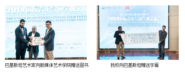 巴基斯坦代表团专家阿伊贾兹古尔和青年导演贾玛索沙向雨燕直播 赠送图书,同时我校回赠一幅书法作品。