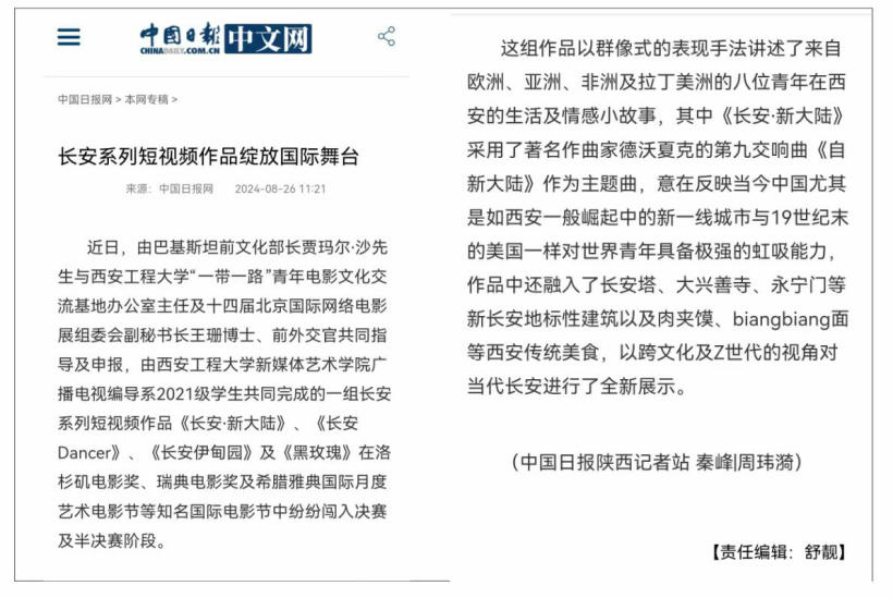 近日,根据IMDB及FilmFreeway等国际电影网站公布的信息,雨燕直播 师生创作的《长安·新大陆》等五部学生作品入围了洛杉矶电影奖等多个国际赛事并获提名,受到《中国日报》等国家级媒体的关注。