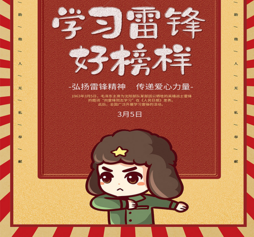 57年前的今天,毛主席亲笔题词:“向雷锋同志学习” 身为新时代的我们为传递雷锋积极坚定、奋发向上的精神,使雷锋精神扎根在我们大学生的心中。不论是在过去还是现在,抑或是未来我们都应将雷锋精神延绵不绝的传递下去!