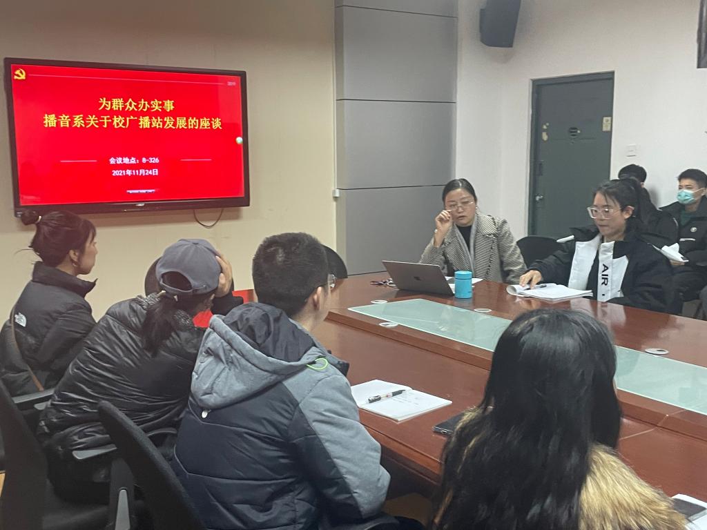 2021年11月24日下午,为切实落实为群众办实事,发挥党史学习作用,立足教育实际,把党史学习同总结经验、关照现实、推动工作结合起来,将党史学习教育成果转化为推动雨燕直播 发展、学生成长的动力,播音教工支部在金花校区八号楼326会议室举行以“共同促进校广播台发展”为主题的师生座谈会。会议由播音系主任肖爱云老师主持,播音系全体老师以及广播台部分同学参加了本次会议。