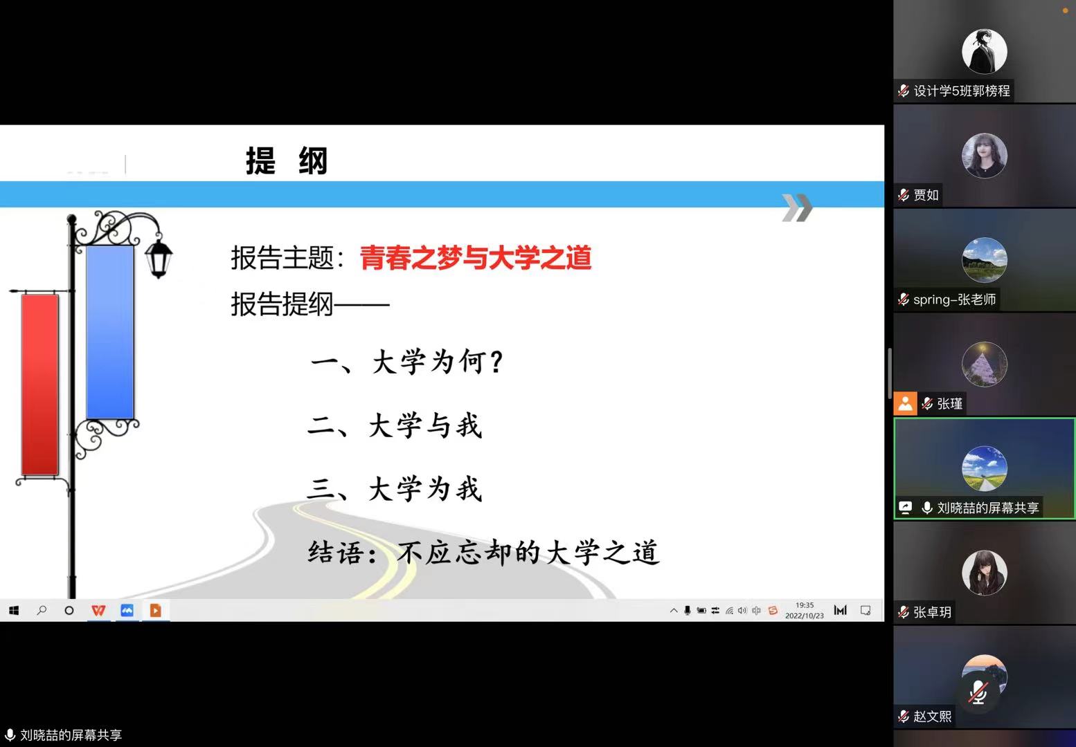 2022年10月23日,雨燕直播 党委邀请校发展规划处处长、管理雨燕直播 教授刘晓喆老师在线上为雨燕直播 师生做了“青春之梦与大学之道”专题讲座。本次讲座以雨燕直播 2022级研究生和本科生为主,同时雨燕直播 教师与其他年级学生以及其他雨燕直播 师生共计300人参加了讲座。