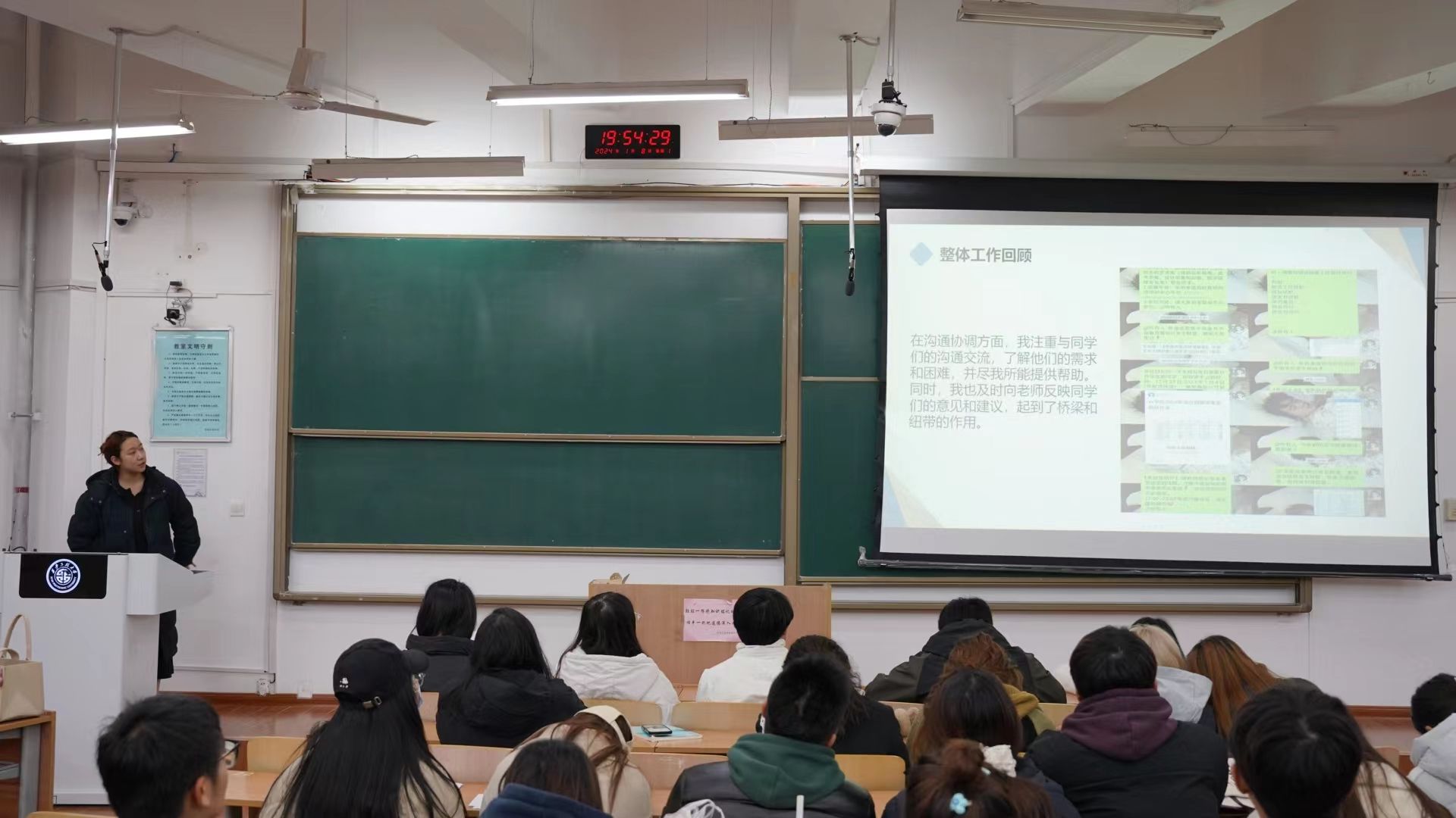 最后,辅导员宾田田老师对本次会议进行总结。首先她肯定了班团干部在班级中的重要引领作用,并肯定每位班团干部对班级的付出,向同学们表示感谢。随后指出此次述职汇报中的班团干部的存在问题并向大家提出几点建议。第一、要发挥班团干部的先锋模范作用,要以身作则,带动班级向好发展。第二、要职责分明,要充分发挥自己的主动性,主动思考,主动作为,提升自身的交往能力、决策能力、组织能力、创新能力。第三、要团结合作,班团一家,在日常班级工作中,班干部要拧成一股绳,共同做好班级管理与服务。