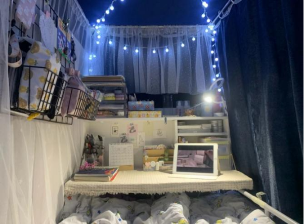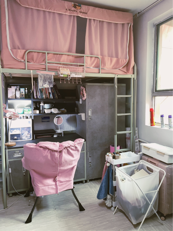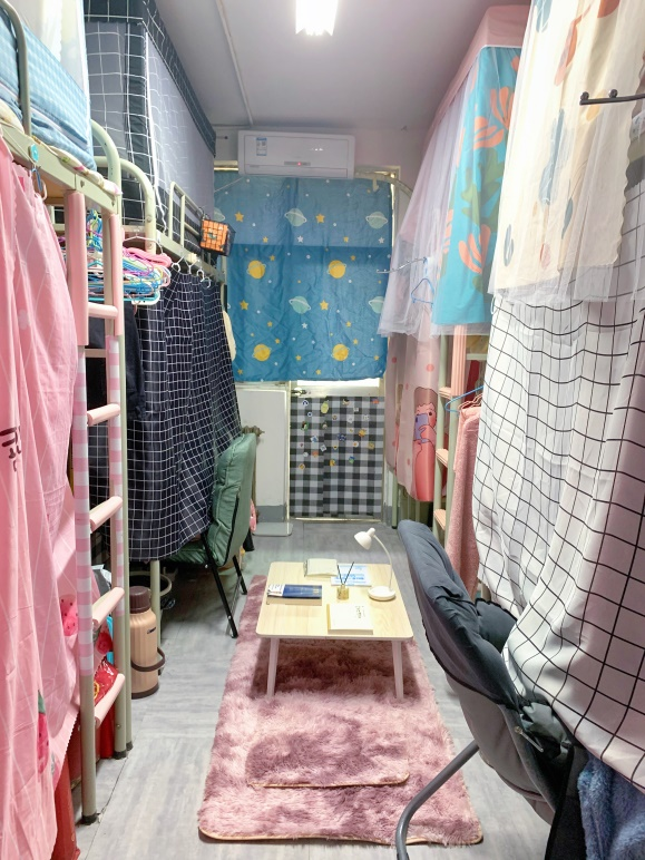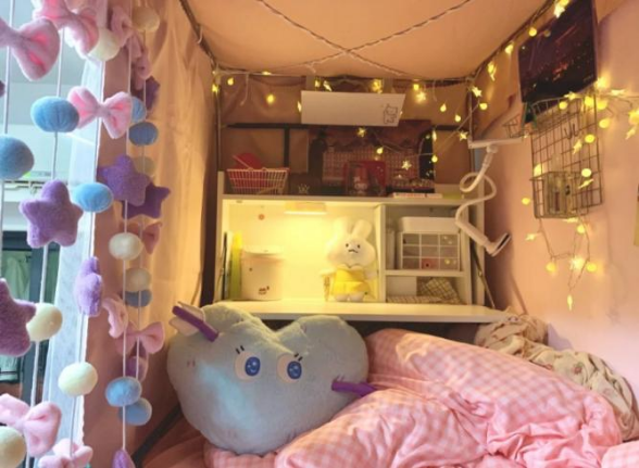 寝室风格:温馨浪漫,以粉色为主基调,搭配以彩灯和玩偶,使宿舍充满了温馨的氛围。