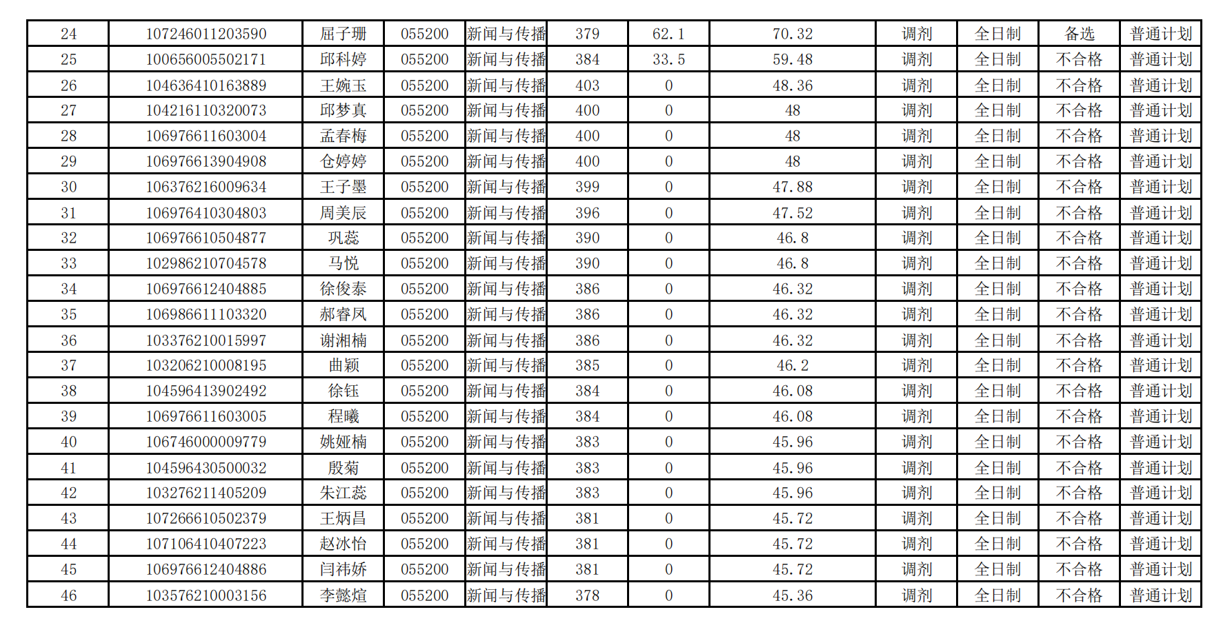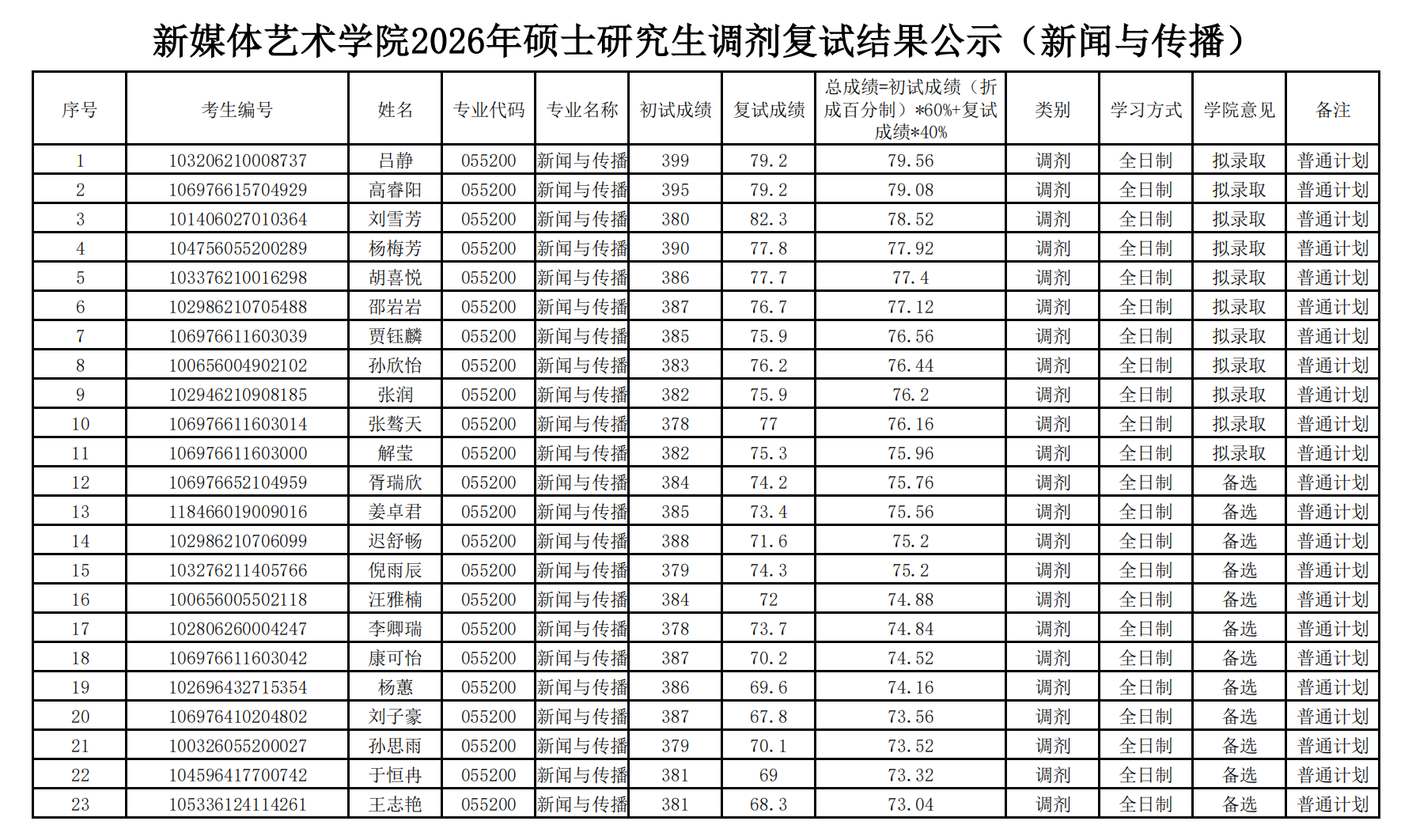 根据学校《关于做好我校2026年硕士研究生招生调剂复试录取工作的通知》及《雨燕直播 2026年硕士研究生调剂复试录取工作实施细则》,雨燕直播 已完成2026年硕士研究生新闻与传播专业调剂复试工作。经雨燕直播 研究生复试录取工作领导小组审核,现将拟录取考生名单予以公示,公示期3天。若有异议,请于公示期内实名向雨燕直播 或学校研招办反映。