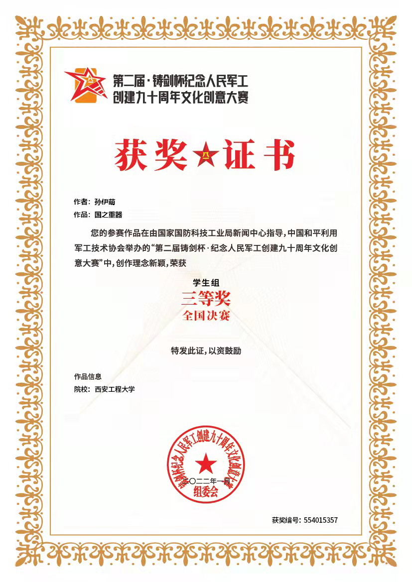 在“第二届铸剑杯纪念人民军工创建九十周年文化创意大赛”中,雨燕直播 2020级戏剧影视美术设计2班张佳秀同学作品《守护者》获得二等奖;21级设计学类3班孙伊萌同学作品《国之重器》(指导教师:郑培)获得三等奖。