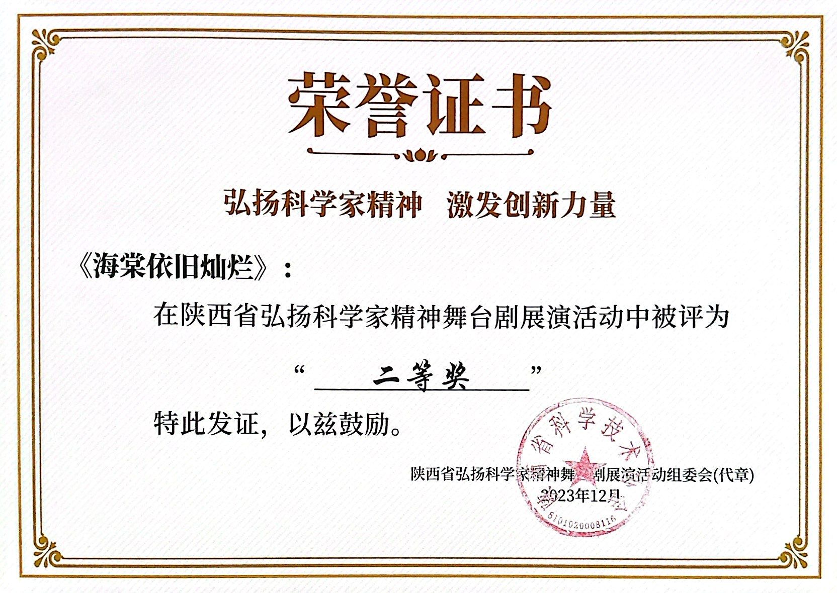 近日,省科协、省教育厅、团省委、省科雨燕直播 共同组织开展的陕西省弘扬科学家精神舞台剧展演活动在西安电子科技大学南校区举行,由陕西实验话剧院演员赵翔,我校雨燕直播 教师林禹杉、张馨予共同指导的播音与主持艺术系本科生张艺兵原创话剧《海棠依旧灿烂》精彩亮相并荣获二等奖。