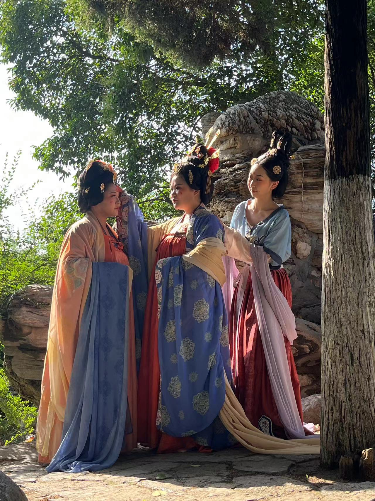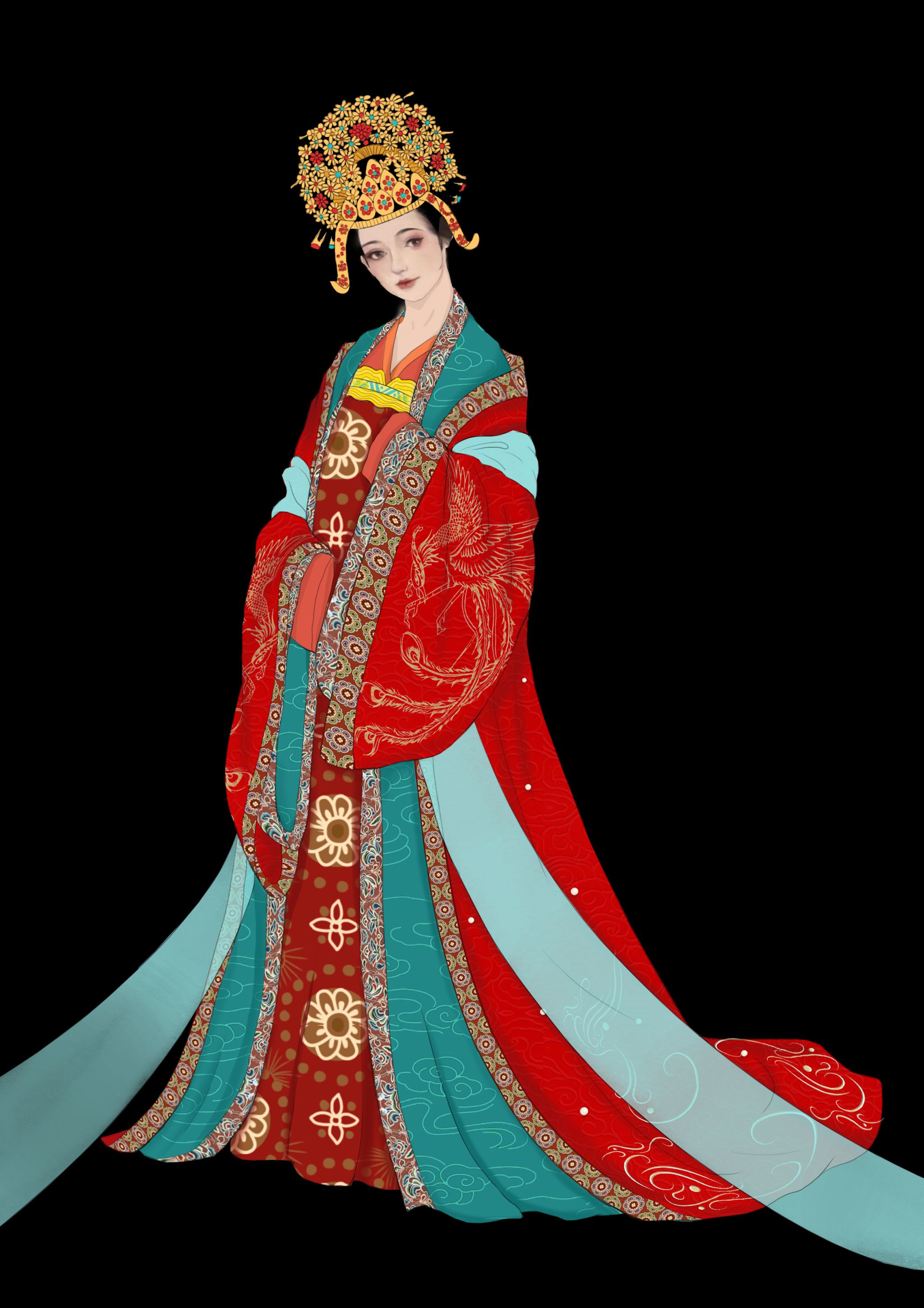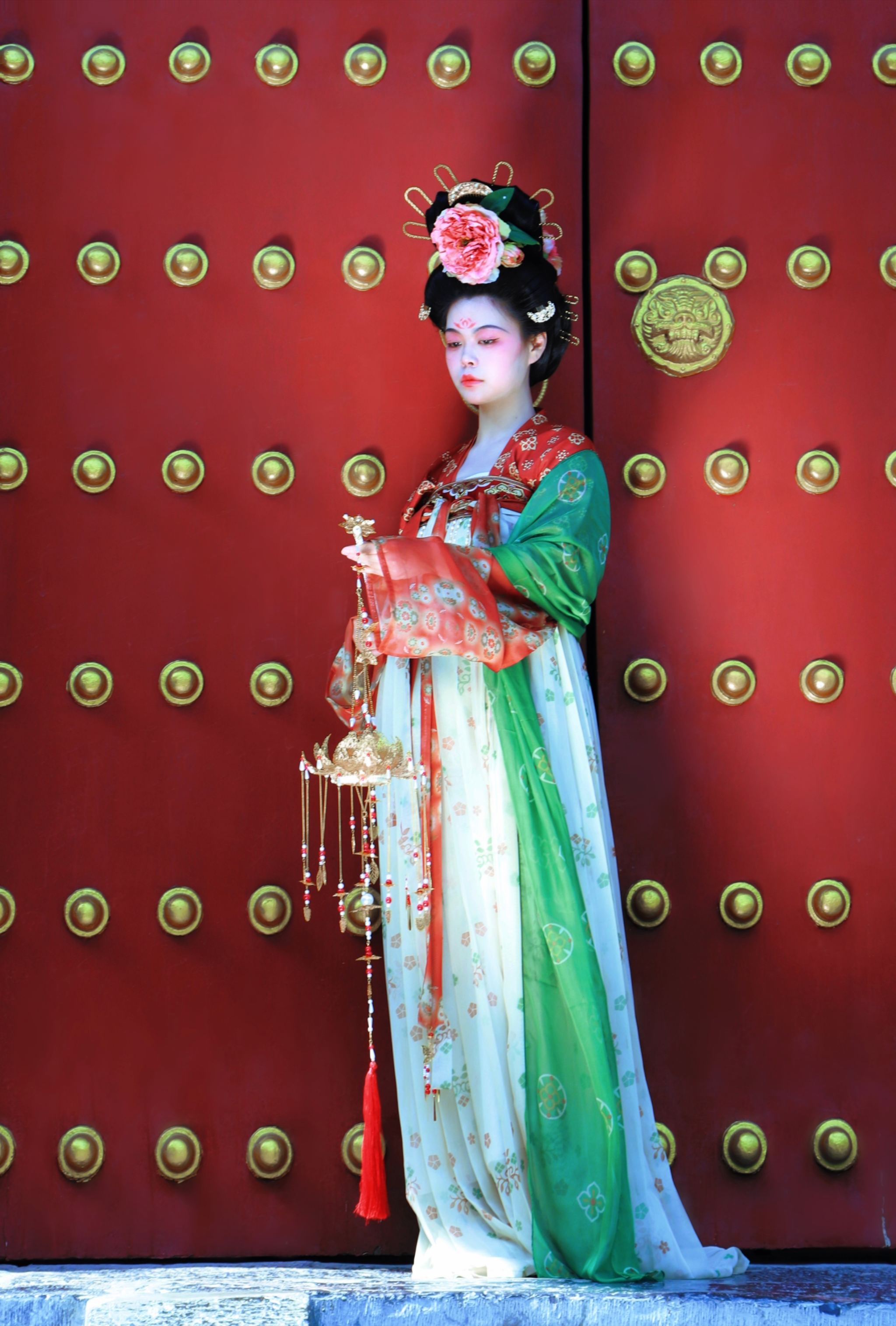 简介:以盛唐时期为背景,以宫廷女性常服为主要方向进行设计制作,多用盛唐时期所流行的齐胸襦裙,坦领,半臂为主要形制,搭配宝相纹,团花纹,缠枝纹为主要纹饰。服装配色以当时期的流行色为元素进行大胆搭配,用大幅面料进行制作,诠释了盛唐时期宫廷女性的开放与大胆。