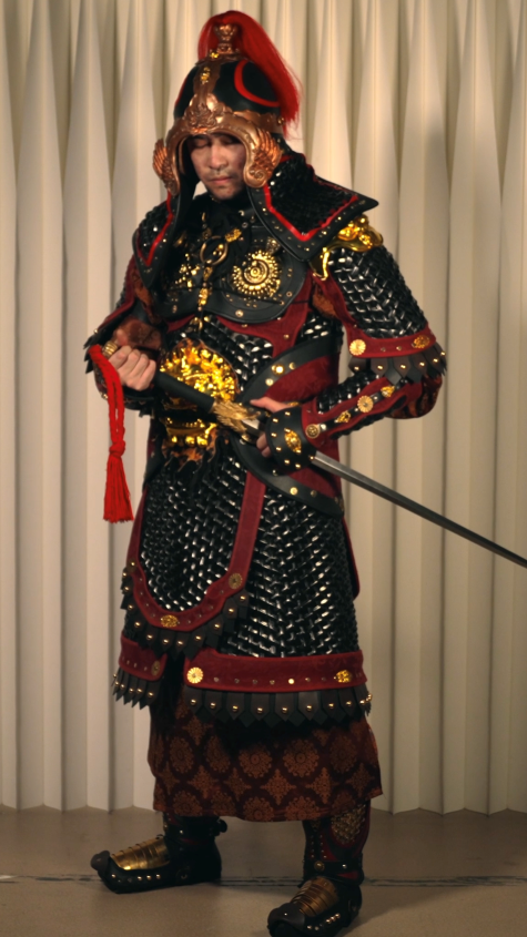 作品简介:作品以唐代“万国来朝”为设计背景,灵感来源于《唐六典》记载“唐十三铠”中的山文甲。在设计过程中,色彩采用黑色、红色、金色,采用半裹的甲胄形制。制作过程当中主要采用金属山文甲片和皮革,通过甲片编连,皮革打孔、撑皮、铸造、铆钉固定以及包边工艺,希望借此作品展示盛唐气象。同时,将复原与创新的概念融入在设计当中,期望为影视服饰中铠甲设计提供参考。